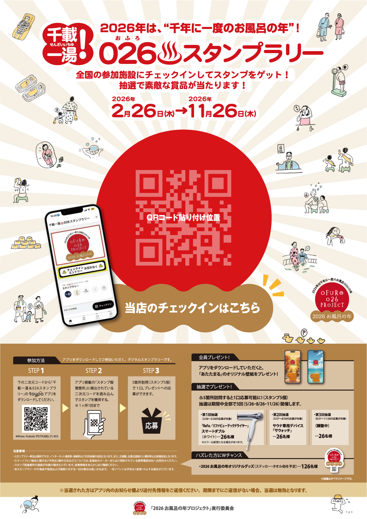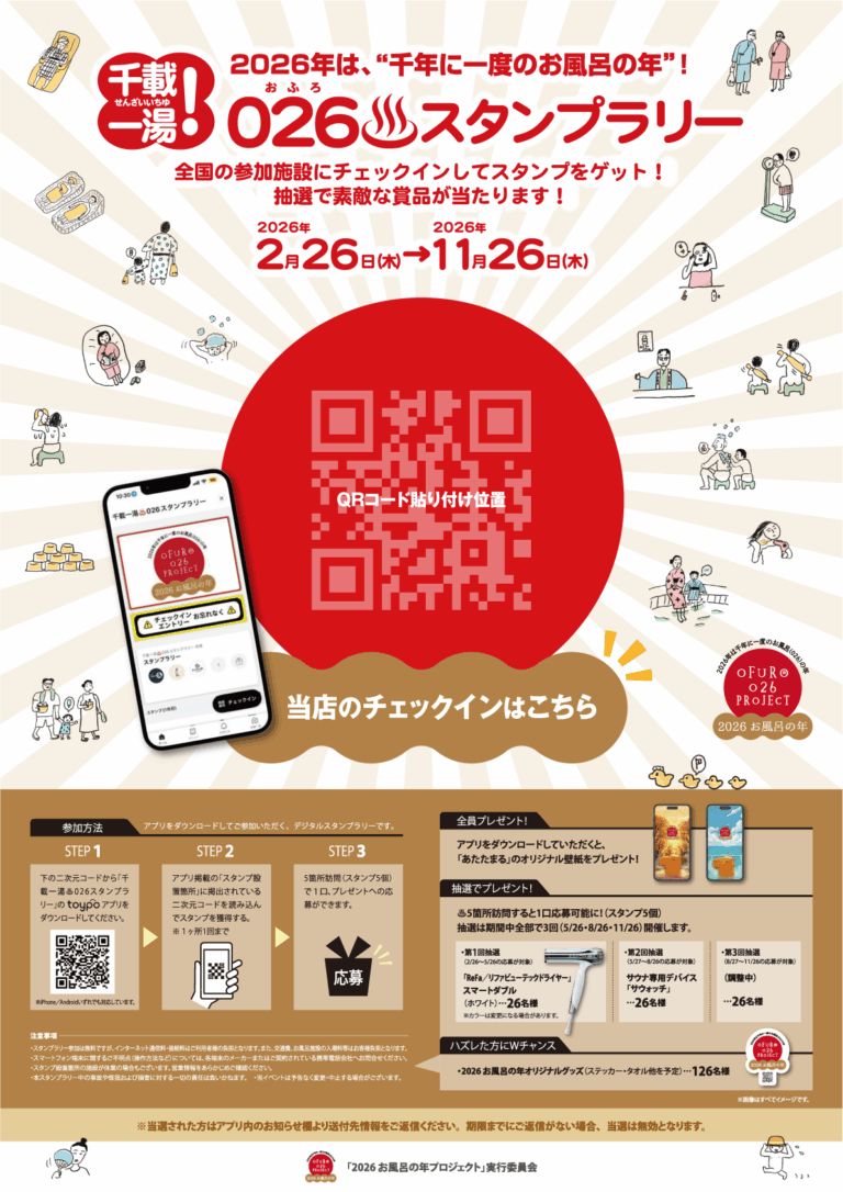 【千載一湯!】026おふろ♨スタンプラリー開催✨ 千年に一度の026(おふろ)の年! 越のゆグループではこの特別な一年を通して、 おふろの楽しさ・気持ちよさ・奥深さを感じていただける様々なイベントを開催します! 【千載一湯!】026♨スタンプラリー開催! 全国の参加施設にチェックインしてスタンプをGET! 抽選で素敵な商品が当たります✨ ニュース・イベント その他のニュース・イベント 福豆プレゼント 1月イベントのお知らせ EXIT 萎えぽよエリアぶちアゲ活性化ツアー ~ あなたの街にチャラ男を呼びませんかSP ~ 福井県小浜市振替公演 開催決定のお知らせ!! 濱亭 秋メニュー販売中!!
