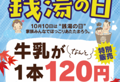 2025年10月10日(金)は♨銭湯の日♨ 毎年恒例のイベントを開催します! 今年の開催期間は10/10(金)~13(月)の4日間です! 牛乳が1本120円! 自販機の牛乳各種が特別価格120円で飲めちゃう …[続きを読む →]