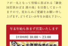 🎍謹賀新年🎍 旧年中は、濱の湯をご愛顧いただきまして、誠にありがとうございました。 今年は更なるサービスの質の向上、お客様に喜んで頂けるよう スタッフ一丸となって取り組む所存でございます。 本年も一層お引き立てを賜ります …[続きを読む →]