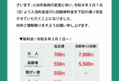 平素より濱の湯をご利用いただき、誠にありがとうございます。 令和8年3月1日(日)から、入浴料を下記の通り改定させていただくことになりました。 何卒ご理解賜りますようお願い申し上げます。
